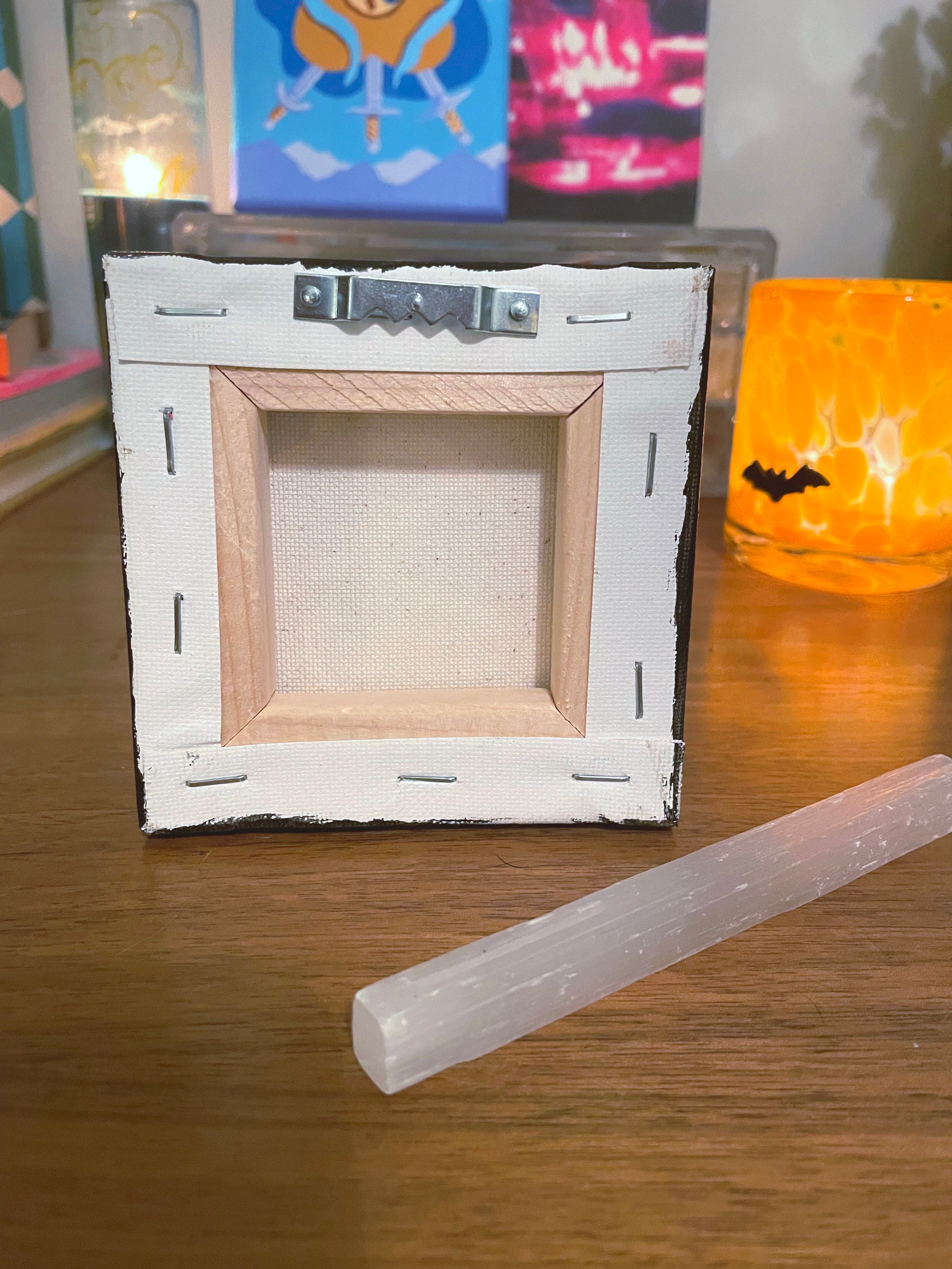 It is hand painted on a 4 x 4 inch canvas with acrylic paint and glitter embellishments. Installed with a bracket on the back for effortless hanging.